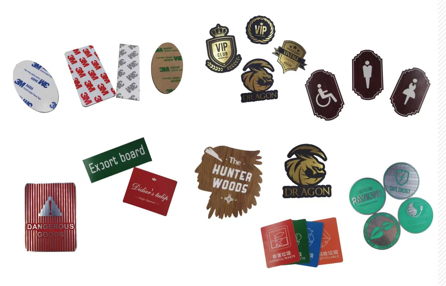 Sinalização, placas de identificação, rótulos industriais, artesanato personalizado, etiquetas de identificação, gravuras decorativas.